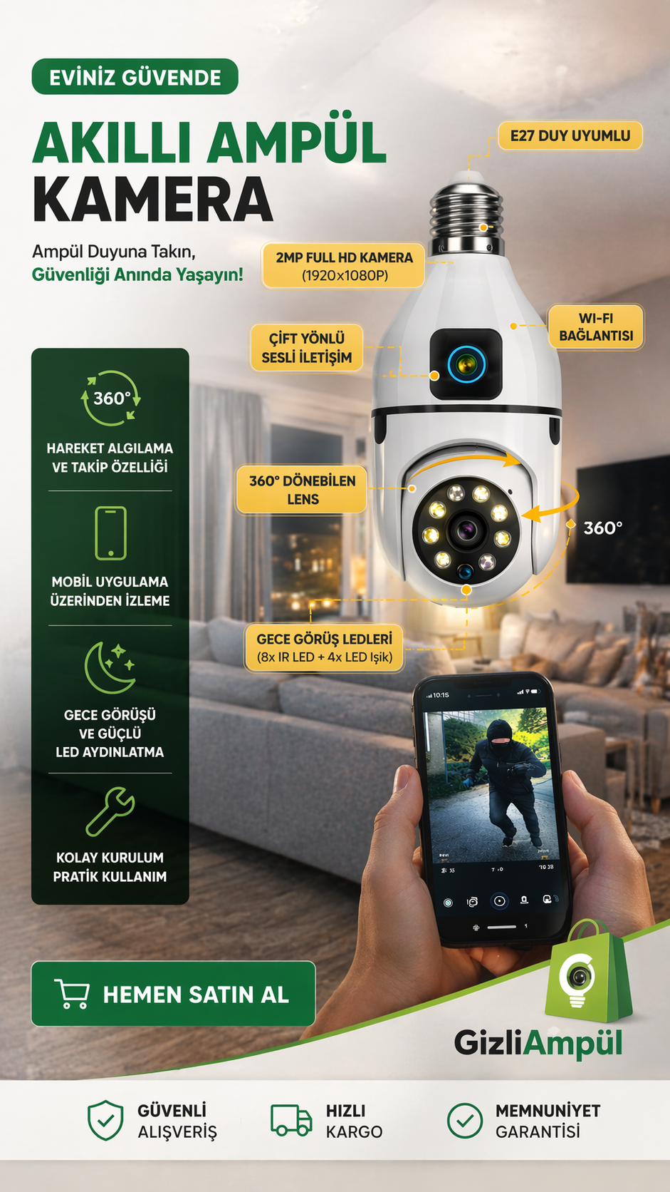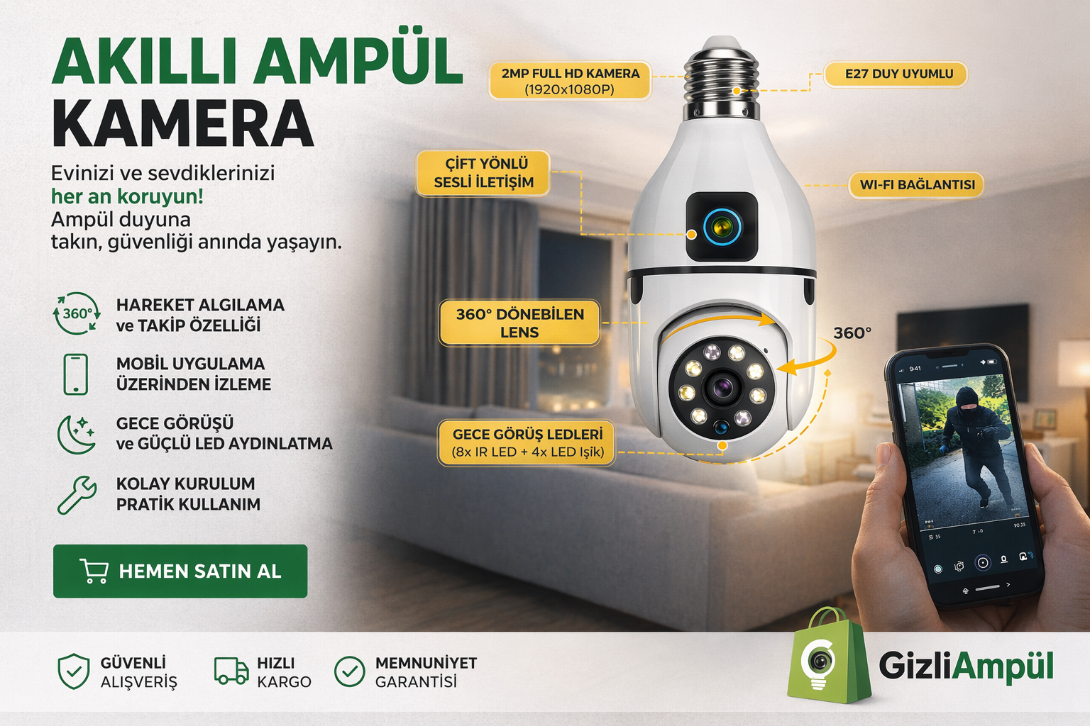 GizliAmpül, klasik kameralara göre çok daha pratik ve güçlü bir çözümdür. Ampul gibi takılır, kurulum gerektirmez. 360° görüş açısı ile kör nokta bırakmaz, Full HD görüntü ve gece görüşü ile her an net izleme sağlar. Mobil uygulama ve anlık bildirimlerle her yerden kontrol edebilirsiniz